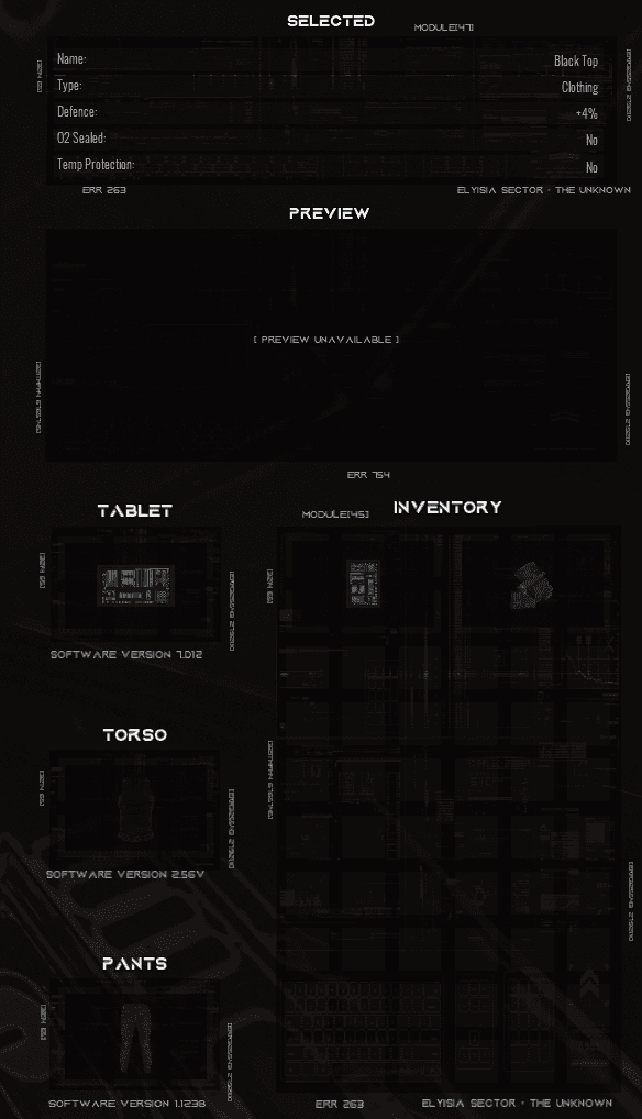The player inventory uses the same unified system as the vessels. Outfits can be equipped directly, dynamically swapping the player’s clothing on the mesh. Equipment like the tablet, spacesuit, and flashlight only function when they’re actually slotted, keeping gameplay tied directly to what the player is carrying. The Player can go as far as looting entire storage container items, which have a unique stacked inventory menu each. Although not shown in the image below.